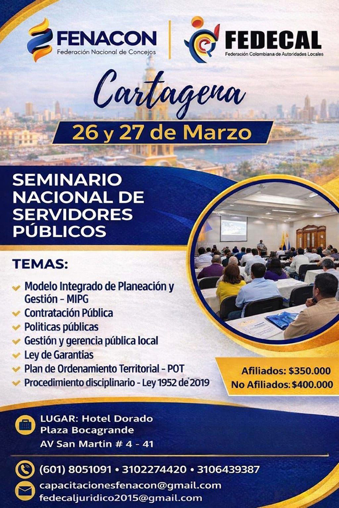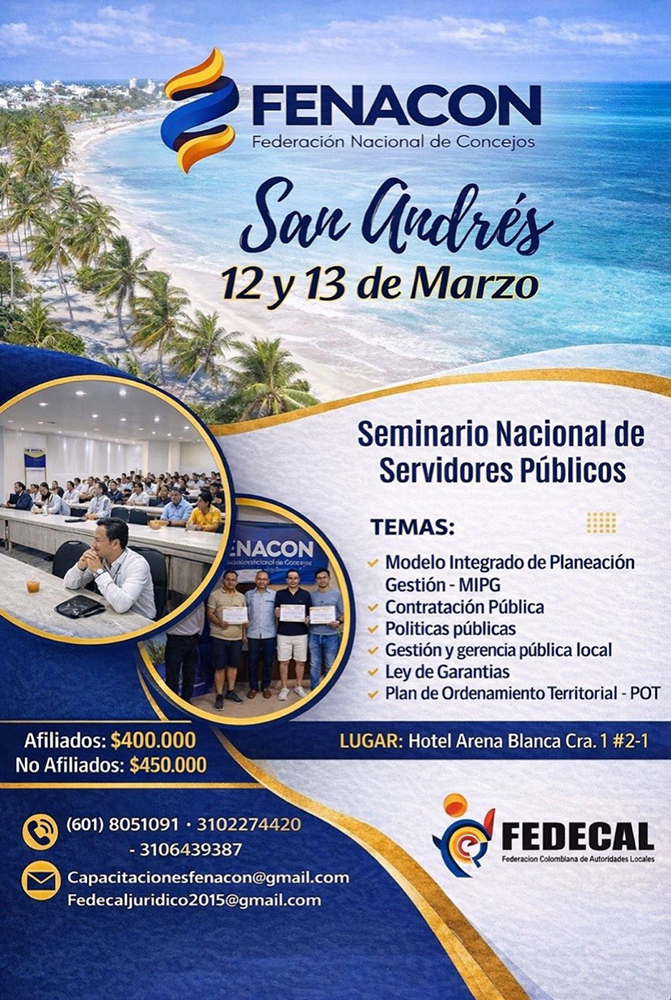 La Federación Nacional de Concejos – FENACON, en alianza con FEDECAL, invita cordialmente a todos los servidores públicos del país a participar en el Simposio Nacional de Concejales y Servidores Públicos, que se llevará a cabo los días 29 y 30 de abril en la ciudad de Valledupar.